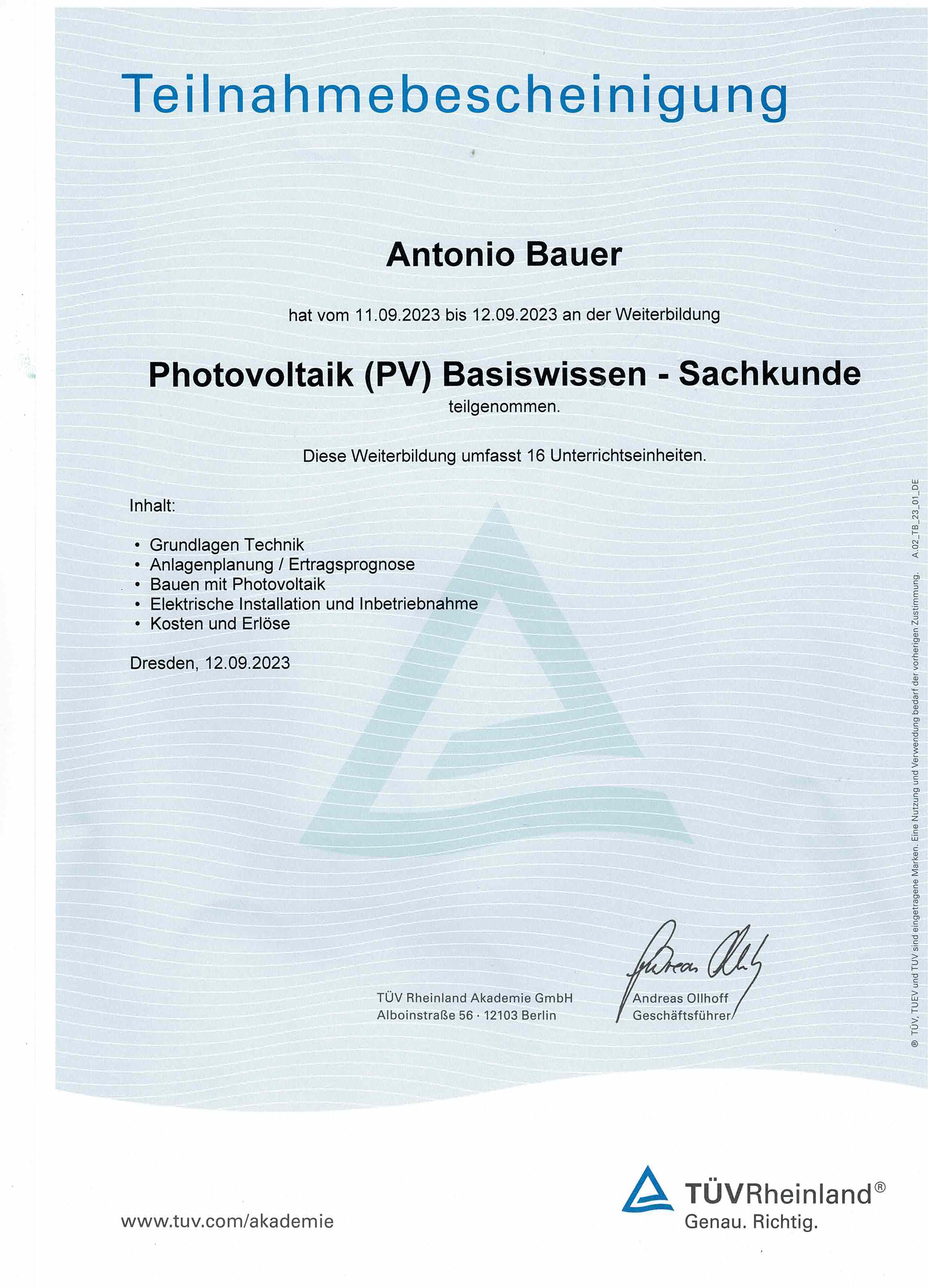 Aber auch die berufliche Förderung unserer Beschäftigten steht an erster Stelle. So haben wir in 2023 an einer Weiterbildung zum Thema „Photovoltaik“ teilgenommen. Damit sind wir auch qualifiziert, entsprechende Anlagen fachgerecht aufzubauen um die Zukunft mitzugestalten.
